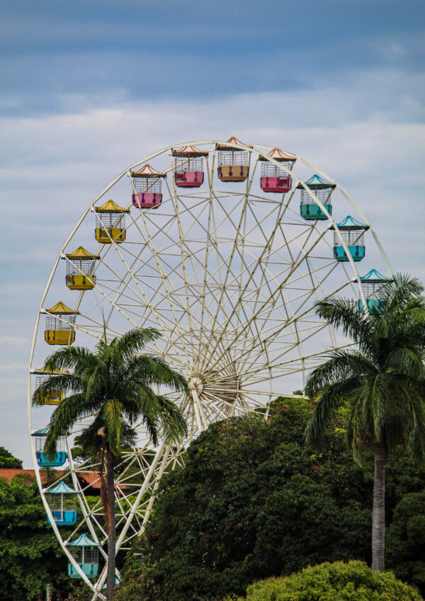 Uma atração de parque que colore o céu, emoldurada suavemente pelas palmeiras. A imagem transmite leveza, nostalgia e a magia dos fins de tarde festivos. Um quadro que traz alegria sutil e charme tropical para qualquer ambiente.