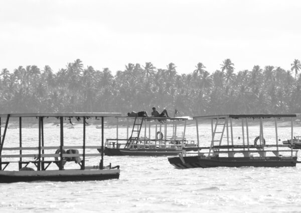 Nesta imagem em preto e branco de uma praia Alagoana, o tempo parece ter parado. Vista do mar em direção à areia, a cena revela serenidade no descanso dos homens e tranquilidade na dança das palmeiras ao vento. A ausência de cor destaca as sombras, silêncios e memórias. Um quadro que leva qualquer ambiente a paz de um de simples à beira-mar